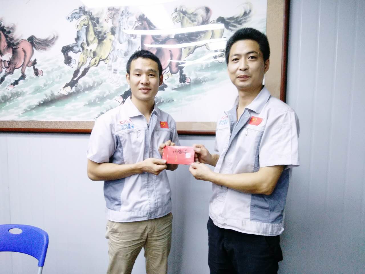 胡總經理(左)為物控部代表王文奎(右)頒發部門獎金