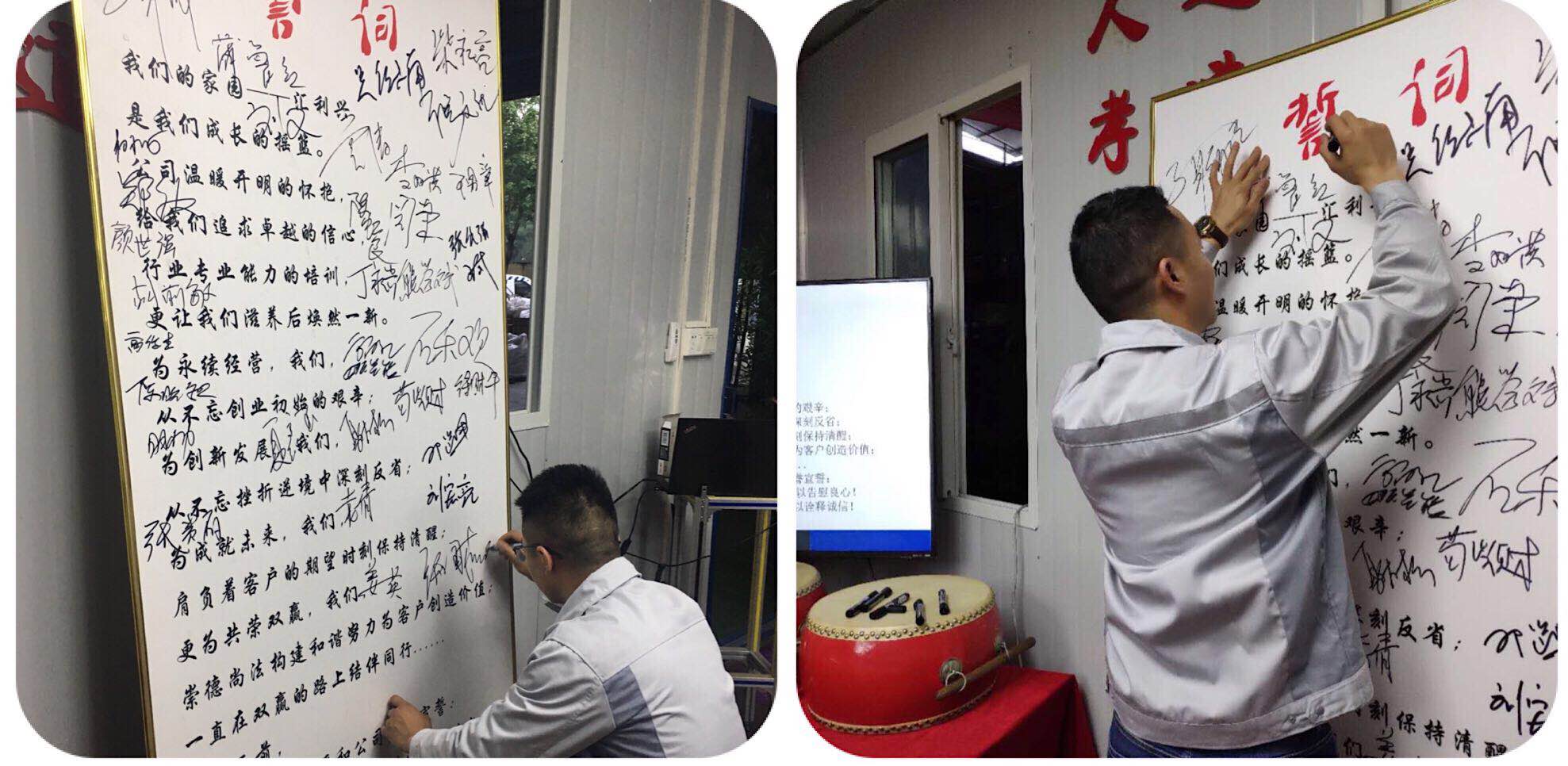 會議第二項議程,企業文化的展示。全體匯興人整肅衣冠對匯興人倍加推崇的“三道文化”(孝道、商道、人道)鄭重地鞠躬,莊嚴宣誓企業愿景:“成為全球領先的智能自動化產業鏈集成服務商”,企業使命:做受尊敬的好人,造受尊敬的產品,辦受尊敬的企業,建受尊敬的平臺,企業精神“用情做人、用心做事”,團隊精神“忠誠團結、勤奮進取”,工匠精神:創于手、精于工、智于器、匠于心、品于行,行為準則:口中有德、目中有人、手中有技、心中有愛、行中有善,職業準則:對工作熱臉、對同事笑臉、對錯誤紅臉、對浪費黑臉、對榮譽爭臉。隨后二位核心精英擊士氣鼓,士氣比武器更重要,現場氣氛熱烈、振奮人心。