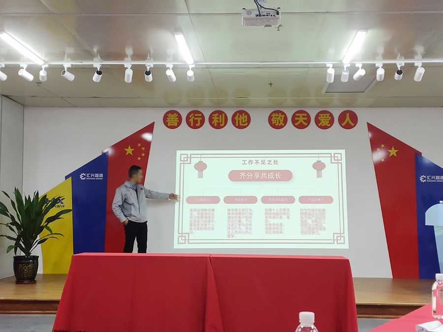 會議第一項議程,企業文化宣讀。全體人員整肅衣冠,對倍加推崇的三道文化“孝道、商道、人道”鄭重鞠躬,莊嚴宣誓企業愿景:“成為行業優秀的智能自動化產業鏈集成服務商”,企業使命:做受尊敬的好人,造受尊敬的產品,辦受尊敬的企業,建受尊敬的平臺,企業精神“用情做人、用心做事”,團隊精神“忠誠團結、勤奮進取”,工匠精神:創于手、精于工、智于器、匠于心、品于行等。 會議第二項議程,胡總結理作2020年度銷售總結暨2021年工作計劃。通過四個章程(一、年度工作概述、二、年度完成情況、三、業態及成果、四、工作不足,五、2021工作計劃及策略),依次對2020年度銷售情況進行深度分析。 第一章,工作概述。胡總通過以下四點來詮釋年度工作整體情況,1.公司實力板塊上升、目標達成率高;2.匯利興自落地西南片區十年歷程以來,行業口碑逐漸上升;3.通過以“個人積極性、鍛造創新能力、延伸產業鏈”等行為上對團隊進行了深度的剖析,指出在面對新環境的挑戰下,團隊要以創機遇抓機會的思想決策持續開展各項工作;4.自覺、自律、自勵——銷售部全員不斷在學習成長,用所學習的專業知識助力公司奔跑前行。自覺完成每次公司的委托,自律完成每一次托付,自勵督促自己蛻變成長!