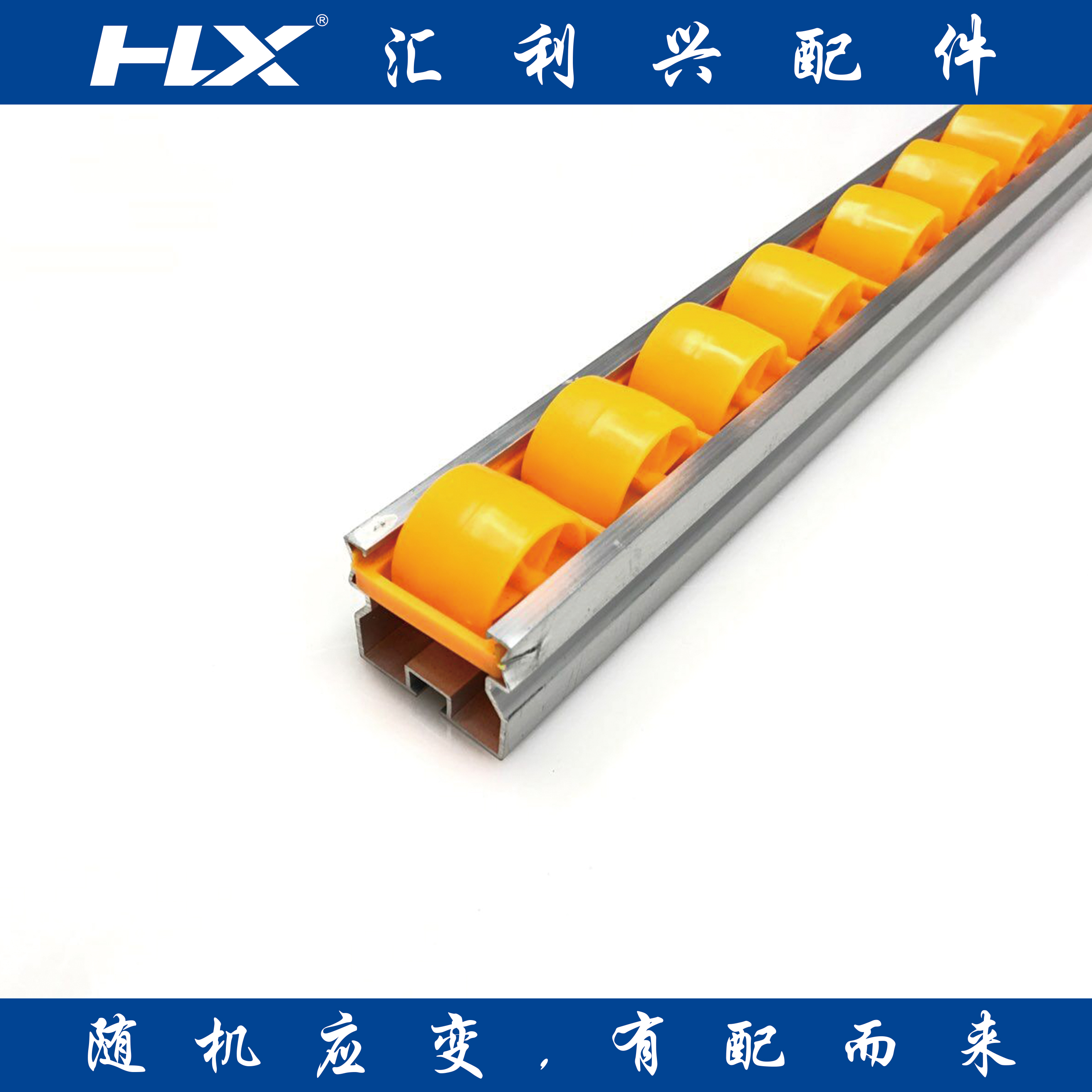 匯利興產(chǎn)品這流水線配件流利條系列,流利條主要用于輸送、倉儲系統(tǒng)配套產(chǎn)品,可用作滑軌、護欄、導(dǎo)向裝置、滾動性能好、成本低。滾輪采用高品質(zhì)的熱塑性塑料制成,具有摩擦系數(shù)小、抗沖擊、壽命長、耐酸堿性、耐潮溫等優(yōu)點。當(dāng)貨物重量超過額定的負(fù)荷時,可在一個通道安裝多根流利條。安裝傾斜度取決于重量以及流利架的深度,一般3O~6O(5%~9%)。通常在深度方向上每隔600mm~800mm安裝一根支撐梁以增強流利條的剛度。滾輪顏色可選:黃色,藍色,白色,黑色等其他顏色。輪距常用為:35mm,45mm  并可以根據(jù)實際使用情況定尺生產(chǎn)。我司專業(yè)生產(chǎn)鋁全金流利條,載重流利條,板金流利條,鋁全金流利條接頭,板金流利條接頭等流水線配件。