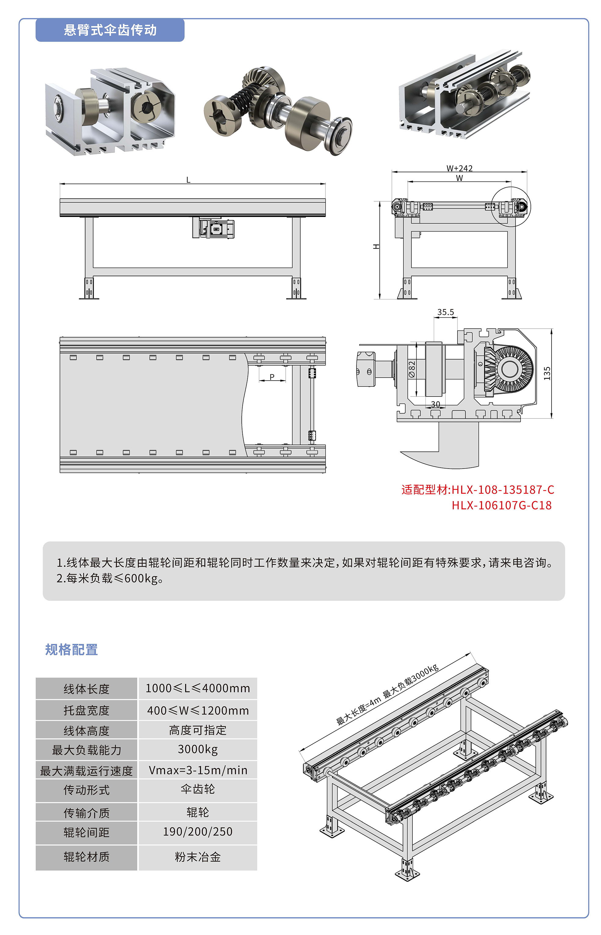 采用135187鋁型材,傘齒驅動,粉末冶金滾輪鑲嵌銅套實現積放功能,負載3000kg/米,最大負載速度15M/min, 輪距190、200、250可選,適用托盤寬度400-1200mm,線體長度范圍1000-4000mm, 高度根據需求定制.